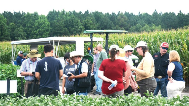 Az augusztus 6-án tartott Blackland Farm Managers Tour rendezvényen a Green Valley Farms farmon, Columbia városában a részvevők megtekintik a szójabab és kukorica kutatási parcellákat. Az 55 éves Blackland Farm Managers Tour, Észak-Karolina legnagyobb mezőgazdasági rendezvénye, 400 fő látogatott el a Hyde megyei farmra. (John Hart)
