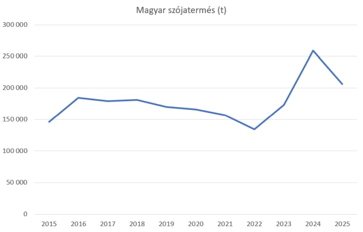 Magyarországon 206 ezer tonna szója teremhetett a területi és a hozamadatok alapján. Ez 20%-kal kevesebb, mint a 2024-ben elért rekord, de így is a valaha feljegyzett, második legjobb eredmény az országban.