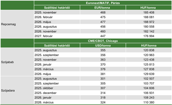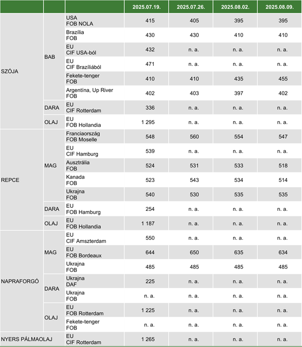 A Stratégie Grains adatai szerint Argentínában (FOB Up River) a szójabab azonnali kikötői ára 12 dollárral 406 dollár/tonnára emelkedett, miközben a szeptemberi 9 dollárral 400 dollár/tonnára csökkent június 13. és július 11. között. Brazíliában a szójabab ára (FOB Paranagua) az azonnali szállítási határidőre vonatkozóan 8 dollárral 418 dollár/tonnára nőtt, a szeptemberi és az októberi egyaránt 10 dollárral 423, illetve 409 dollár/tonnáig ereszkedett. Az amerikai szójabab azonnali exportára (FOB Gulf) 7 dollárral (409 dollár/tonna), a szeptemberi 19 dollárral (408 dollár/tonna), az októberi 2 dollárral (407 dollár/tonna) volt alacsonyabb ugyanekkor. Ukrajnában 383 dollár/tonna volt a szójabab spot piaci ára július 11-én. Az Európai Bizottság adatai szerint az argentin szójababbal 394–406, a brazíliaival 420–438, az amerikaival 389–419, az ukrajnaival 383–388 dollár/tonnáért kereskedtek július 2. és augusztus 7. között. Az AKI PÁIR adatai szerint a szójabab áfa és szállítási költség nélküli termelői ára 160,4 ezer forint/tonna volt július negyedik hetében. A chicagói árutőzsdén (CME/CBOT) a szójabab augusztusi jegyzése 353–363 dollár/tonna, a szójadaráé 287–302 dollár/tonna tartományban alakult július 11. és augusztus 7. között. A szójaolajat 1163–1269 dollár/tonna között (augusztusi lejárat) jegyezték ugyanekkor.