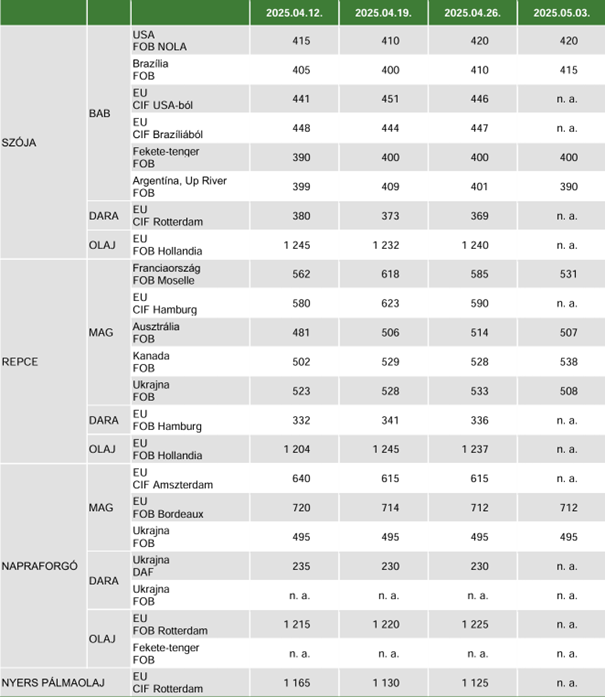 Az Oil World áprilisi projekciójában a 2023/2024. évihez képest 8 százalékkal kisebb, 54,6 millió tonna napraforgómag-termésre számít világszinten a 2024/2025. gazdasági évben. A globális felhasználás 55 millió tonna, a termény zárókészlete pedig 4,1 millió tonna lehet. A Tallage szerint a gazdák Romániában és Bulgáriában kora tavasszal megkezdték a napraforgó vetését, Spanyolországban a sok csapadék miatt a szokottnál később kezdődött a vetési kampány. Az Európai Unióban 4,9 millió hektár lehet a napraforgó vetésterülete a 2025/2026. évi szezonban, ami az előző évit csaknem 1 százalékkal haladná meg. Romániában 1,2 millió hektárt (–9 százalék), Franciaországban 770 ezer hektárt (+1 százalék) jeleznek a Tallage szakértői. Magyarországon az AM tájékoztatása szerint a 746 ezer hektárra várt terület 82 százalékán került a földbe a napraforgó-vetőmag április 29-ig. Az AKI PÁIR adatai szerint a nagy olajtartalmú napraforgómagot (LO) 207,7 ezer forint/tonnáért (+47 százalék) vásárolták a feldolgozók és a kereskedők április utolsó hetében. Az ipari napraforgómag (magas olajsavas napraforgómaggal együtt) áfa és szállítási költség nélküli termelői ára átlagosan 225,8 ezer forint/tonna (+55 százalék) volt.
