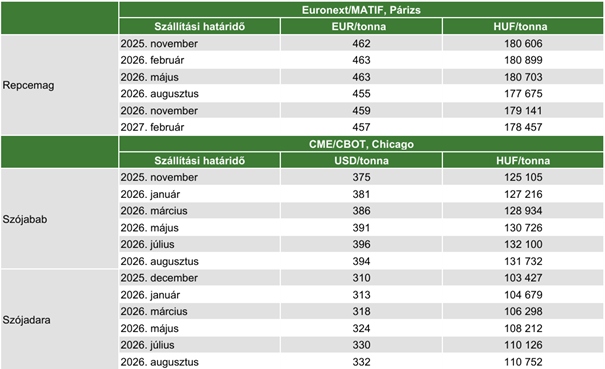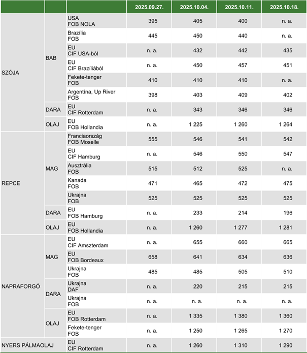 Az AKI PÁIR adatai szerint a szójabab áfa és szállítási költség nélküli termelői ára 152 ezer forint/tonna (–13 százalék) volt október második hetében. A chicagói árutőzsdén (CME/CBOT) a szójabab novemberi jegyzése 370–378 dollár/tonna, a szójadara decemberi kurzusa pedig 302–310 dollár/tonna tartományban alakult október 6. és 17. között. A szójaolajat 1102–1135 dollár/tonna között (decemberi lejárat) jegyezték ugyanekkor.