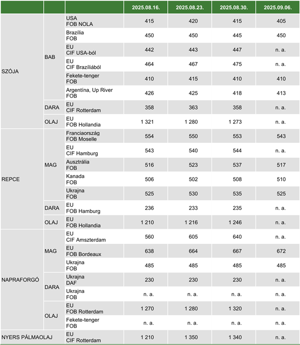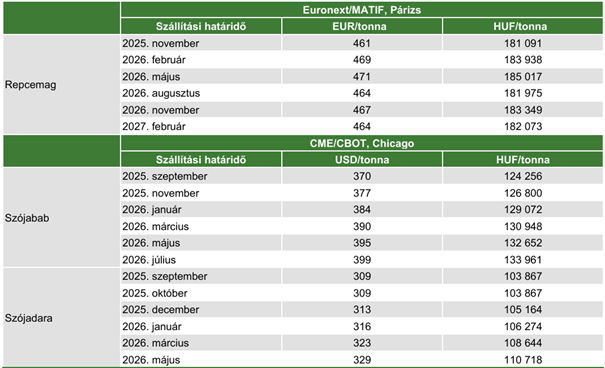 Az Oil World augusztusi előrevetítése szerint a 2024/2025. gazdasági évi szójababtermésnél mintegy 2,5 millió tonnával többet, 425 millió tonna szójababot takaríthatnak be világszerte a 2025/2026. évi szezonban. Az északi félteke termelését 179 millió tonnára (–1 százalék) jelzik. Az USA-ban 2 százalékkal (116,8 millió tonna), Indiában és Kanadában egyaránt 5 százalékkal (10,5 millió, illetve 7,2 millió tonna), Ukrajnában 11 százalékkal (6,2 millió tonna), az Európai Unióban pedig 3 százalékkal (2,8 millió tonna) kisebb kibocsátást jeleznek. Ezzel szemben Kínában 1,5 százalékkal (20,3 millió tonna), Oroszországban pedig 11 százalékkal (7,8 millió tonna) nagyobb termést várnak. A déli féltekén 2 százalékkal 246,3 millió tonna szójababtermést jeleznek a szakértők, ebből Argentínában 49,3 millió tonnát (–2 százalék), Brazíliában 176 millió tonnát (+3 százalék), Paraguayban pedig 10,5 millió tonnát (+7 százalék) takaríthatnak be. A szójabab globális felhasználása 2 százalékkal nagyobb, 420,4 millió tonna lehet a 2024/2025. évi szezonban. A gazdasági év végére 126,4 millió tonna (+4 százalék) szójabab maradhat a tárolókban. A chicagói árutőzsdén (CME/CBOT) a szójabab szeptemberi jegyzése 370–381 dollár/tonna, a szójadaráé 304–328 dollár/tonna tartományban alakult augusztus 25. és szeptember 5. között. A szójaolajat 1115–1197 dollár/tonna között (szeptemberi lejárat) jegyezték ugyanekkor.