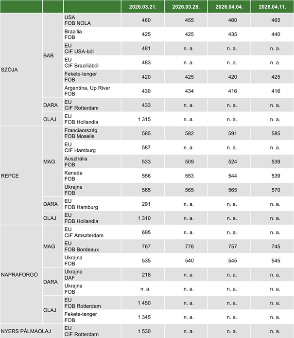 Az Expana adatai szerint Argentínában (FOB Up River) a szójabab azonnali kikötői ára 2 dollárral 442 dollár/tonnára, az áprilisi 17 dollárral 435 dollár/tonnára, a májusi pedig 20 dollárral 433 dollár/tonnára emelkedett február 13. és március 13. között. Brazíliában a szójabab ára (FOB Paranagua) az azonnali szállítási határidőre vonatkozóan 9 dollárral 445 dollár/tonnáig nőtt. Ukrajnában 20 dollárral magasabb, 445 dollár/tonna volt a nyugati határra szállított szójabab spot piaci ára március közepén. Az Európai Bizottság adatai szerint az argentin szójabab ára (FOB Up River) 430–450 dollár/tonna volt márciusban, április 8-ig 416 dollár/tonnára ereszkedett. A brazíliai terménnyel márciusban 422–435, április első felében 428–434 dollár/tonnáért (FOB Paranagua) kereskedtek. Az amerikai szójababbal (FOB Gulf) 462–485 dollár/tonnáért, az ukrajnai terménnyel 425–445 dollár/tonnáért kereskedhettek március 4. és április 8. között. A chicagói árutőzsdén (CME/CBOT) a szójabab májusi jegyzése 426–432 dollár/tonna, a szójadaráé pedig 344–366 dollár/tonna tartományban alakult március 30. és április 10. között. A szójaolajat 1479–1542 dollár/tonna között (májusi lejárat) jegyezték ugyanekkor.